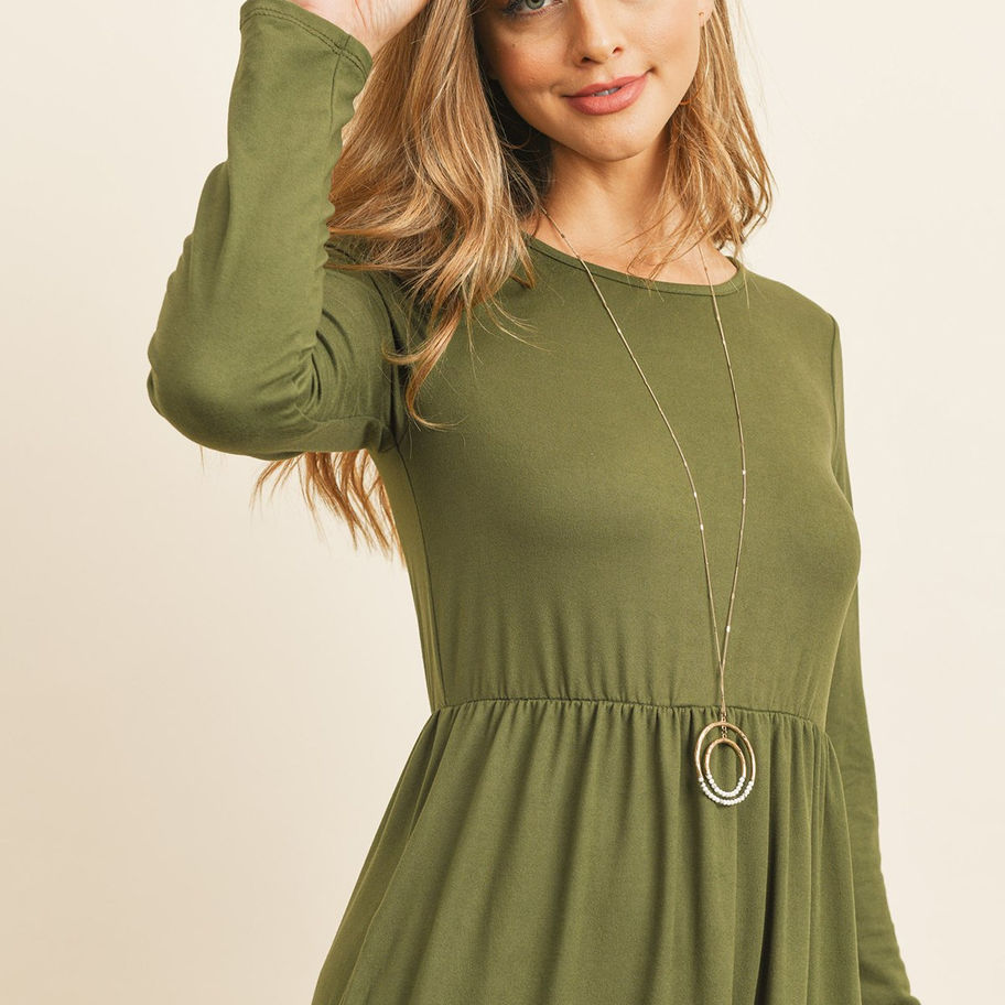 Show off your pretty style when wearing this beautiful dress. It features a crew round neckline, long sleeves, elastic waistband, tiered skirt, and a flowy silhouette. Pair with mule sandals for a casual-cute outfit you can feel confident wearing any day of the week or dress up your look a bit with strappy heels.